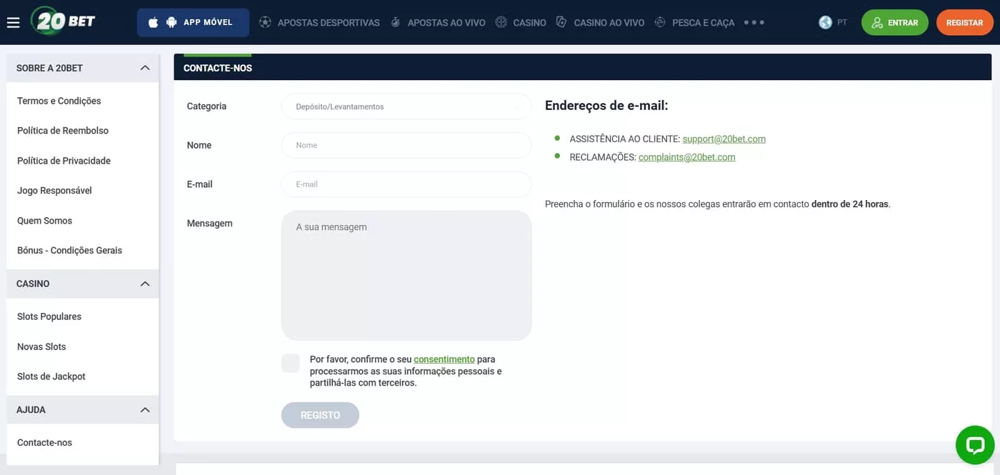 Suporte ao cliente para os jogadores do 20Bet Casino