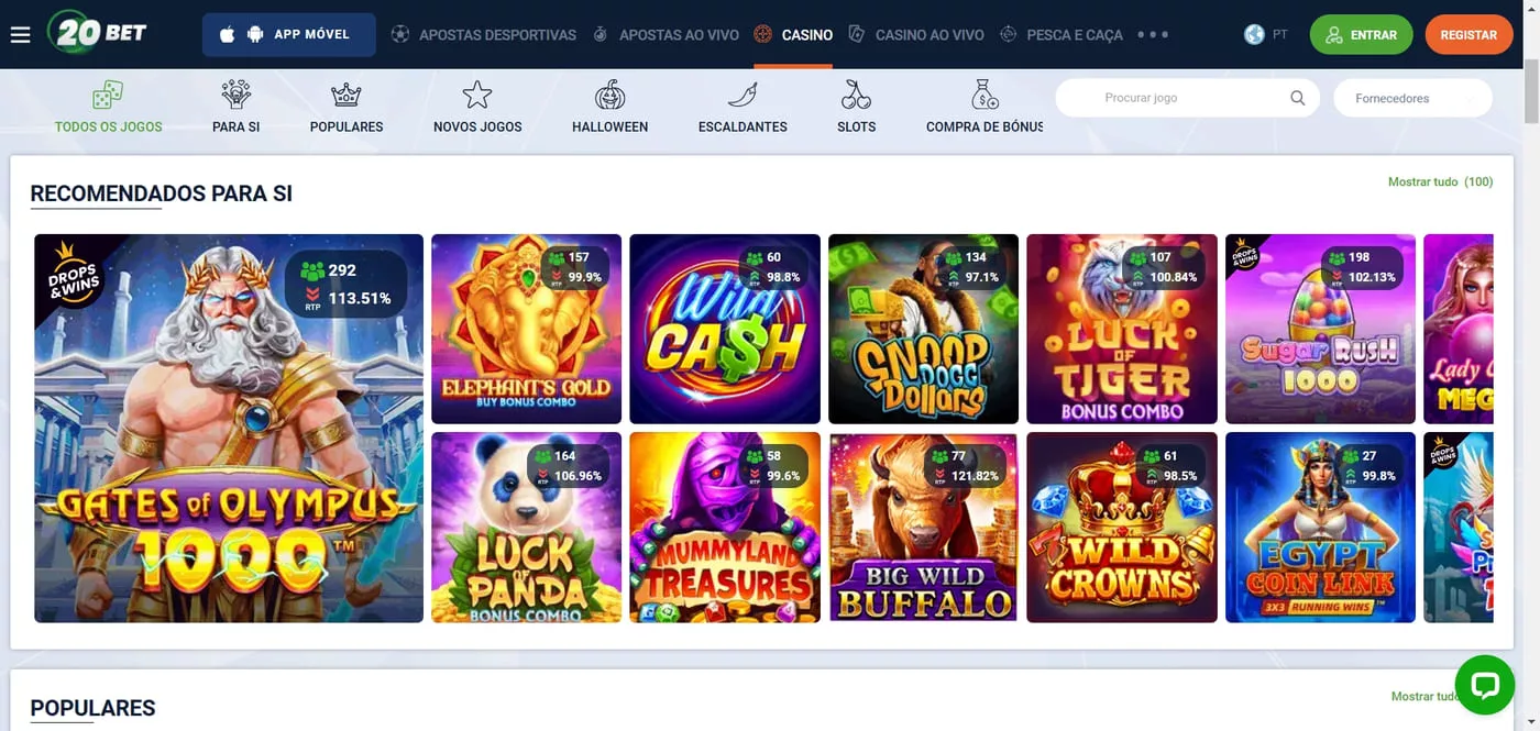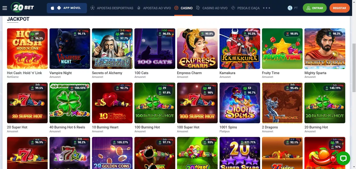 O Casino 20Bet é um dos melhores para quem gosta de jogar nos slots. O facto de o sítio indicar o RTP dos jogos ajuda muito na escolha. Além disso, o site também mostra quais são os jogos de casino populares do momento, o que auxilia na identificação dos que mais estão pagando.
