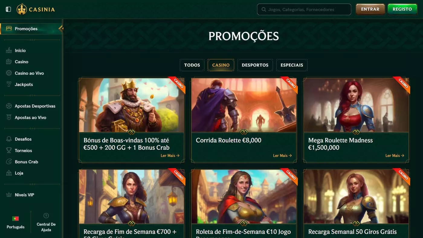 O Casinia oferece bónus de boas-vindas, recargas, e cashback, entre outras promoções exclusivas para os jogadores portugueses. Estes bónus são acompanhados por termos claros e justos, acessíveis a todos os tipos de jogadores.