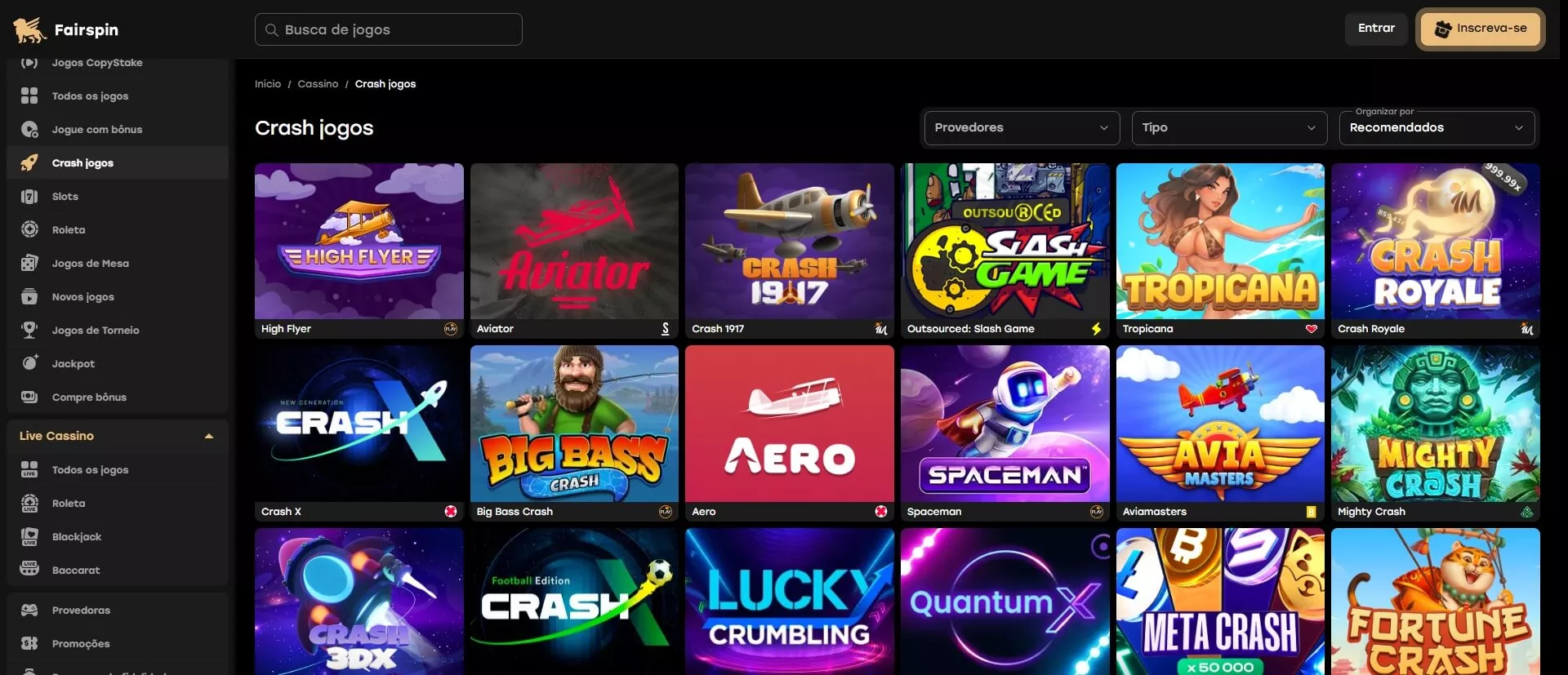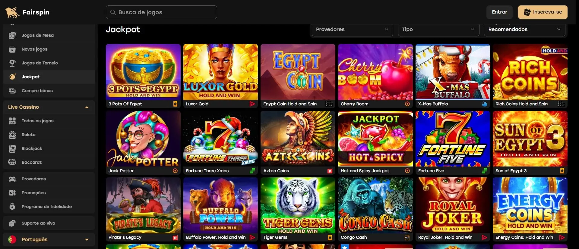 O Fairspin PT exibe os slots num separador indicado, onde o cliente pode filtrar o jogo por fornecedor e por tipo de máquina (megaways, compra de bónus, jackpot…). Pode ainda ordenar os jogos alfabeticamente ou agrupá-los por popularidade.