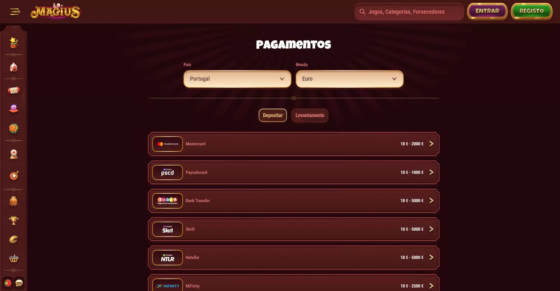 O casino Magius aceita seis métodos de pagamentos tradicionais mais quatro criptomoedas. Os métodos simples incluem carteiras virtuais, como Skrill, Neteller e Mifinity, cartões pré-pagos, como o PaySafeCard, cartões de crédito Mastercard e Transferência bancária. O mínimo de depósito é igual para todos os métodos: apenas 10 euros. O Magius Casino não cobra taxa em nenhum método de depósito. Confira o resumo das informações de pagamentos.