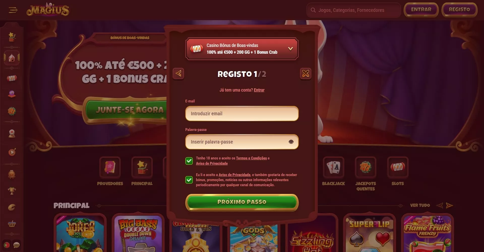Para fazer login no casino Magius, basta fazer o Registo no Casino Magius, no canto superior direito da página. Depois, é só clicar em Entrar, também na parte superior direita, e inserir o e-mail e a palavra-passe escolhidos.