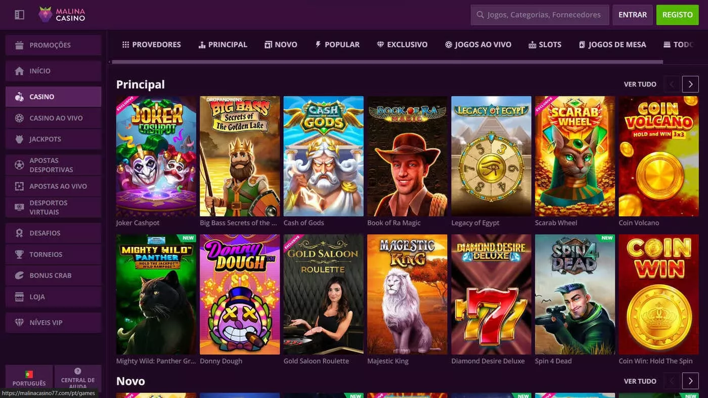 O Malina apresenta uma variedade de jogos de cassino para os jogadores portugueses. No catálogo, as slots estão em evidência, pela quantidade de máquinas disponíveis. A biblioteca de jogos inclui ainda os jogos de mesa, como roleta e póquer, assim como os jogos ao vivo e os programas de tv. O jogador pode filtrar jogos por categoria, por fornecedor ou por popularidade.