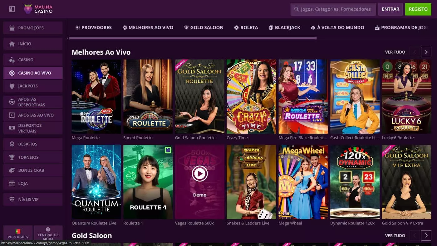 Nos jogos de cassino ao vivo Malina, este apresenta os principais estúdios da indústria, com nomes como a Evolution, a Ezugi, a Playtech e a Pragmatic Play Live.