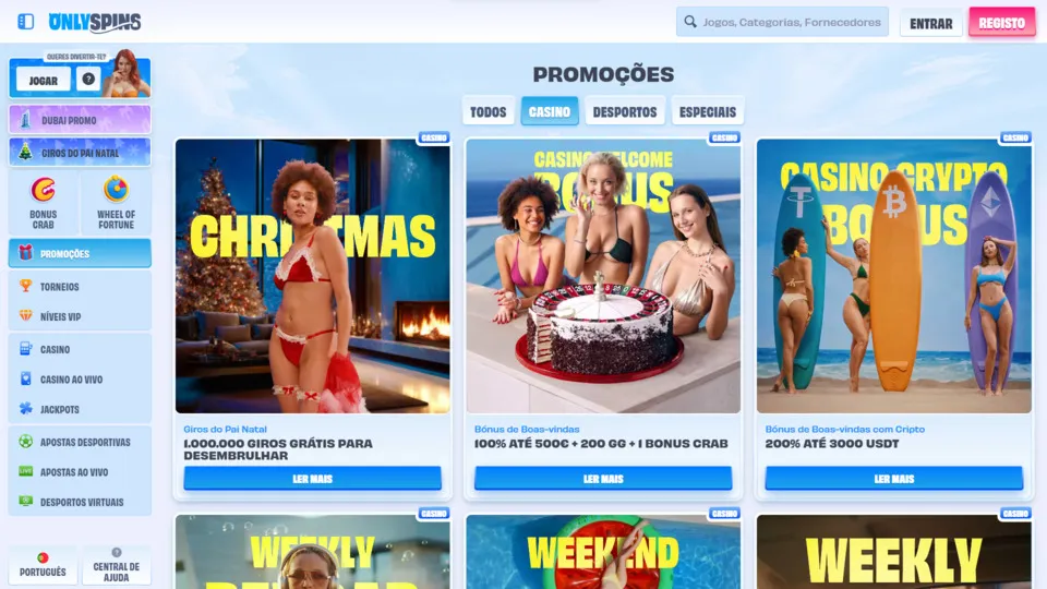 Este casino online destaca-se por oferecer uma experiência de entretenimento imersiva que vai muito além das apostas tradicionais, apresentando um catálogo robusto com mais de 9.000 jogos, que incluem slots de última geração, jogos de mesa clássicos e uma secção de casino ao vivo com crupiês reais. O grande diferencial do site oficial reside na sua forte componente de gamificação, integrando elementos de narrativa e missões interativas que recompensam a fidelidade dos utilizadores. Além disso, o OnlySpins foca-se na modernidade e conveniência, disponibilizando métodos de pagamento rápidos, suporte para criptomoedas e promoções dinâmicas centradas em jogadas grátis, tudo operado sob um ambiente tecnológico seguro e adaptado aos dispositivos móveis.