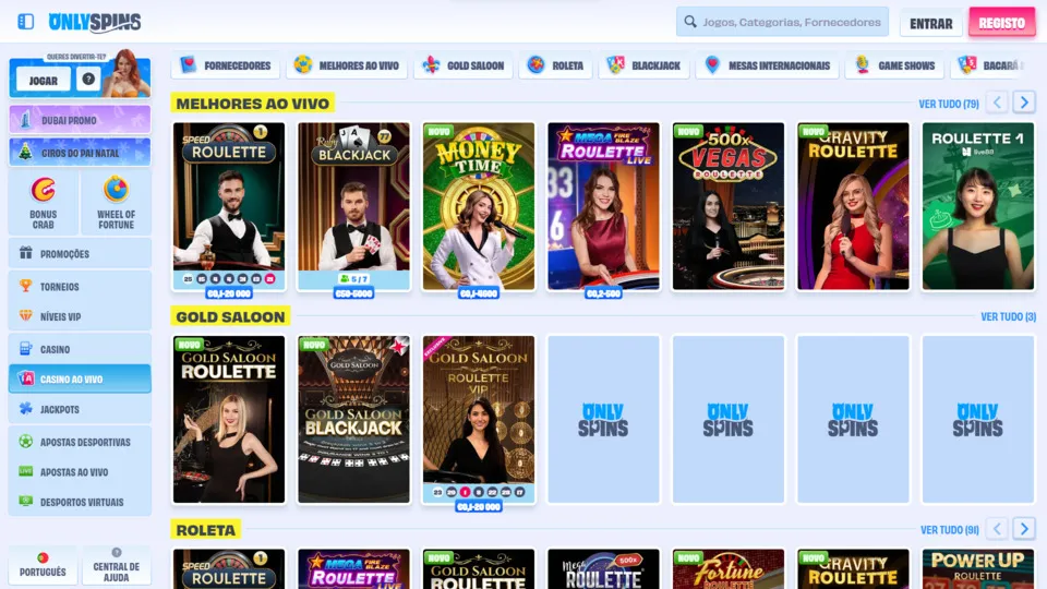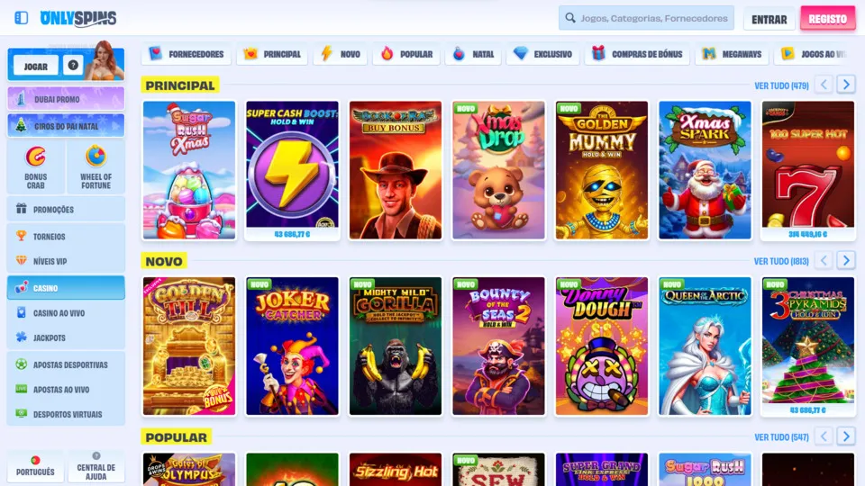 O lobby do casino exibe as diferentes categorias de jogos online do Onlyspins Casino disponíveis, que passam por slots, jogos de mesa, jackpot, jogos de casino com dealer ao vivo e jogos rápidos. Os jogos são listados por categorias, como popular, novo ou exclusivo, que permite ao jogador encontrar os títulos mais rapidamente para jogar no Onlyspins Casino online com dinheiro real. Pode também filtrar os jogos por fornecedor de software, como Pragmatic Play, Novomatic, Playson, Amusnet ou Hacksaw.