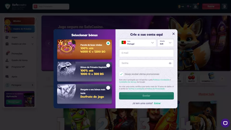 Para fazer login no casino deve aceder à plataforma e clicar na opção “Entrar”. Na janela pop-up deve inserir os seus dados de acesso: e-mail e palavra-passe, e clicar no campo “Entrar”. Será, automaticamente, direcionado para o seu perfil, onde poderá efetuar depósitos e levantamentos, jogar com dinheiro real, entre outras funcionalidades.