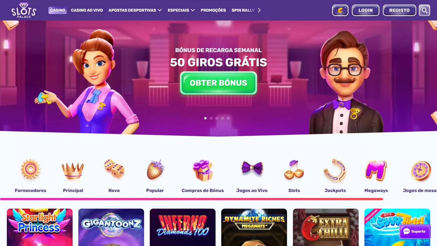 O Slots Palace Casino destaca-se entre os jogadores portugueses devido à sua variedade de jogos, bónus e conteúdo em português. Além das slots, há uma secção de jogos de mesa e casino ao vivo. Com muitas promoções, incluindo um pacote de boas-vindas atraente para todos os jogadores, não perca a oportunidade e crie a sua conta agora mesmo!