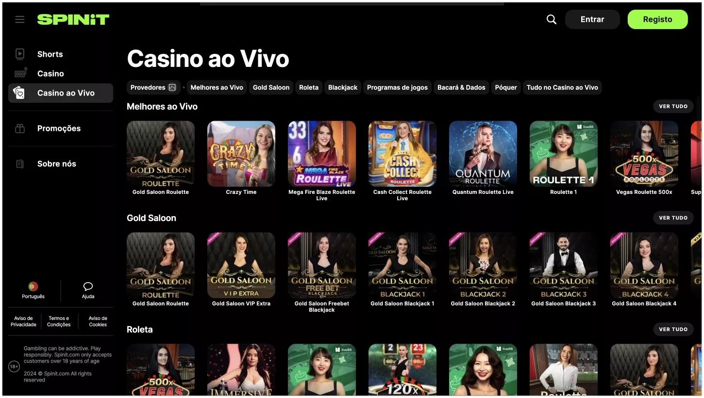 O cassino ao vivo Spinit, com uma área distinta, apresenta os jogos agrupados em diferentes categorias e tipos, com secos para: