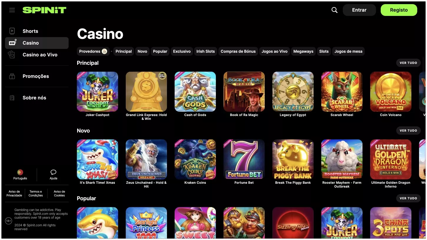 Os jogos de cassino em Spinit, na área dedicada, permitindo escolher o jogo por fornecedor. O utilizador tem acesso a diferentes secos, como