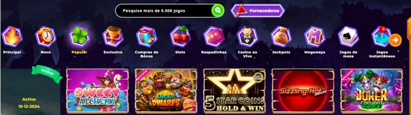 O sítio ‘web’ apresenta ainda diferentes categorias, que permitem aceder aos jogos desejados mais rapidamente, como popular, novo, exclusivo, raspadinhas, entre outras.