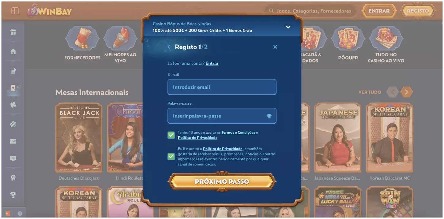 Para fazer login no casino, o jogador deve aceder ao site do Winbay e selecionar a opção “Entrar”. Deverá indicar os dados de acesso, como e-mail e palavra-passe, para iniciar a sua sessão.